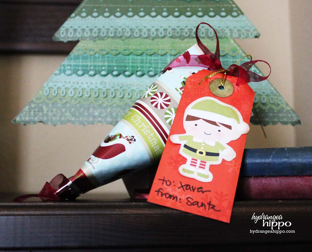 Ink the edges. Add a circle in a contrasting paper to the top of the tag for reinforcement. Add a ribbon and sticker and add to the candy holder.