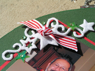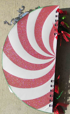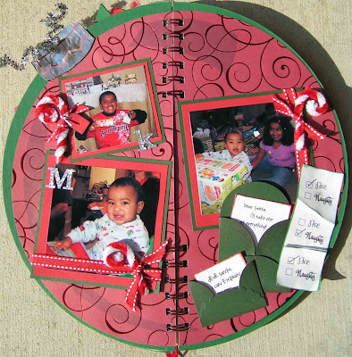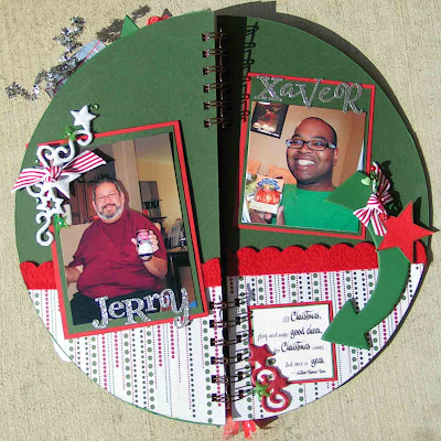 I loved the diecut papers — the starburst candy paper and the holiday ornament paper both make up pages in the book. I used 11.5″ chipboard circles I had diecut on the Accu-Cut machine and then cutin half. All of the paper inside is Reminisce, cardstock by Bazzill, Glitter Cardstock by Doodlebug. Alpha Stickers are from Making Memories, and the rest of the goodies were from my stash. I made diecuts with Quickutz and Sizzix too.