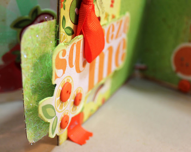 I decorated the pages with coordinating Berrylicious Collection stickers and diecuts. I used a heavy duty stapler to attach some of the elements to the chipboard and acrylic pages alike. Staples are so fun!
