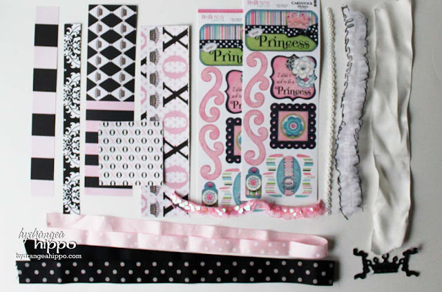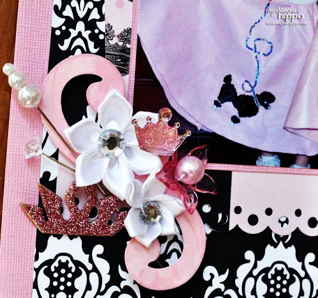Designer Tip: I love using o-rings to add extra interest to my albums by hanging items from them and when I saw the pink shoe and the huge gem I just knew I wanted to use them that way. I make sure and add lots of pockets for tags and photos so that I have plenty of room for extra photos and journaling.