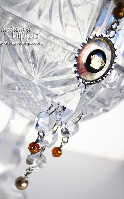 This necklace is surprisingly easy to create but packs alot of impact, great for dressing up a fall sweater or dress! Attach a flattened bottlecap to an eye pin with several beads on it. Then attach a Connie Crystal suncatcher to the bottom of the bottlecap. Add beads to the ends of the crystals on the suncatcher. Add to a piece of velvet ribbon to create a necklace. Create an epoxy accent for the center of the bottlecap with the Epiphany Crafts Shape Studio and then glue to the bottle cap with Tombow Power Bond Adhesive.