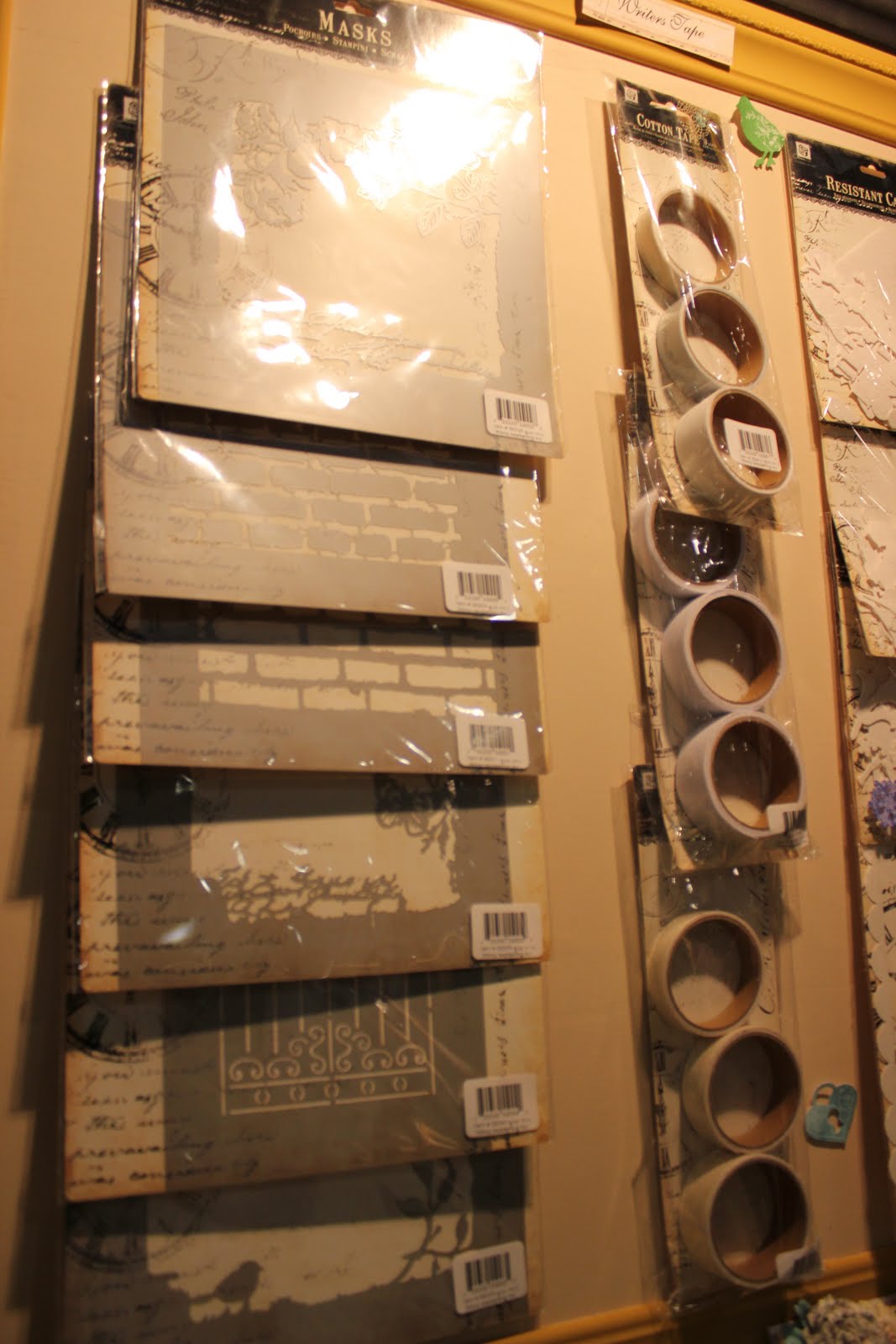 Dyeing and fabric also hit the booths. Lots of diecut and natural canvas pieces were available for you to ink, stamp, and mist to custom match your project. Tools for this, like masks were a BIG hit too — Prima, Crafter's Workshop, Hampton Art, and Pink Paislee all released new stencils and masks for use with spray inks, paint, and more to create custom patterns on any surface.