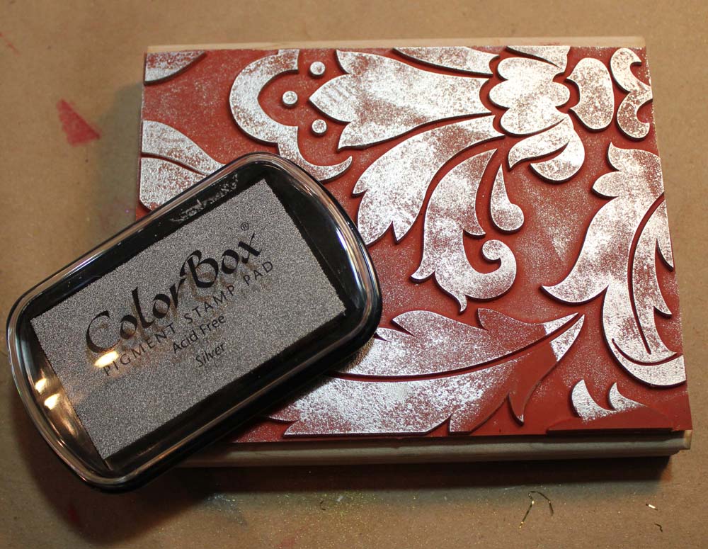 Liberally apply the Colorbox Full Size Pigment Inkpad in Silver to the stamp to cover the image on the stamp completely.