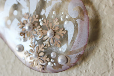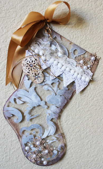 Ink the edges of the acrylic on the front with Colorbox Fluid Chalk Cat's Eye Inkpad in Chestnut Roan. Add chandelier crystals with brass rings. Tie a gold satin ribbon in a bow through one of the rings to act as a hanger. Ink the edges of the punched paper snowflakes and ornaments with Colorbox Fluid Chalk Cat's Eye Inkpad in Chestnut Roan. Tie gold cord in the ornaments and add to the front of the stocking. Add the snowflakes to the stocking with pearl bling in the centers and hang in your favorite spot.