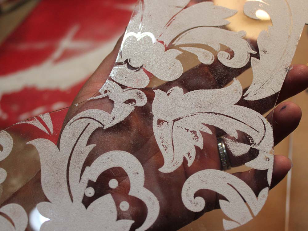 After the stamp has been liberally inked, stamp it onto the back of the acrylic stocking. Continue inking and stamping until the entire surface of the stocking is covered with the pattern. Sprinkle Top Boss Embossing Powder in White over the stamped areas. The powder will stick to the Pigment ink. Gently tap the acrylic stocking to knock the excess powder from the project. Use a Craft Funnel to put the embossing powder back into its container.