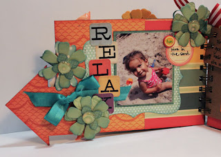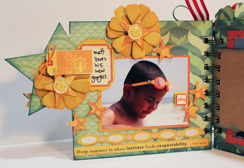 I used a Clear Scraps Chipboard Uturn Album to capture these wonderful “first of summer” memories of my family. The arrows lend a fun, whimsical feel to the album while the beach themed papers I chose help continue the beach theme throughout the book. The Uturn Album is perfect for any occasion that includes action or traveling – change the paper to change the theme but the action of the album remains the same. To cover the pages of the album, I adhered them to paper and then cut them out with a craft knife.