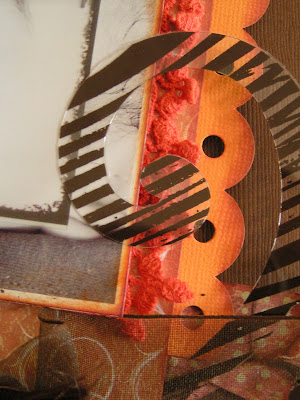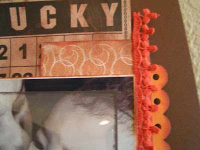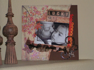 I also used the same papers to create a layout. I finally am using this pic Shawn of Gypsy Isle Photography took! It is of Xaver's mom kissing Matthew on the cheek. I used a MME transparency frame to frame their faces. I cut the Best Creation paper with an exacto knife so the cool embossed leaves would partially cover the photo. I glimmer misted a Jenni Bowlin Bingo Card with “Coffee Shop” and let it dry. I also used some twine to rousch the ribbon and I threaded it through a Lil Davis chipboard slide that says “Family Ties”. Then every couple of inches I tied a pie of brown ribbon that frays easily that I got from last month's Polka Dot Whimsy kit — love it!~ I had cut some flourishes with my Silhouette on a Hambly wood grain transparency and found it in my scraps so I used the last few bits left of that. And I had a couple of loose rubons floating around from 7Gyspies so I used the little bits on the lower right corner of the page. This layout is a major “use your stash of embellies” project for me. All of the paper is from Scrapbook Blvd in Victorville, CA.