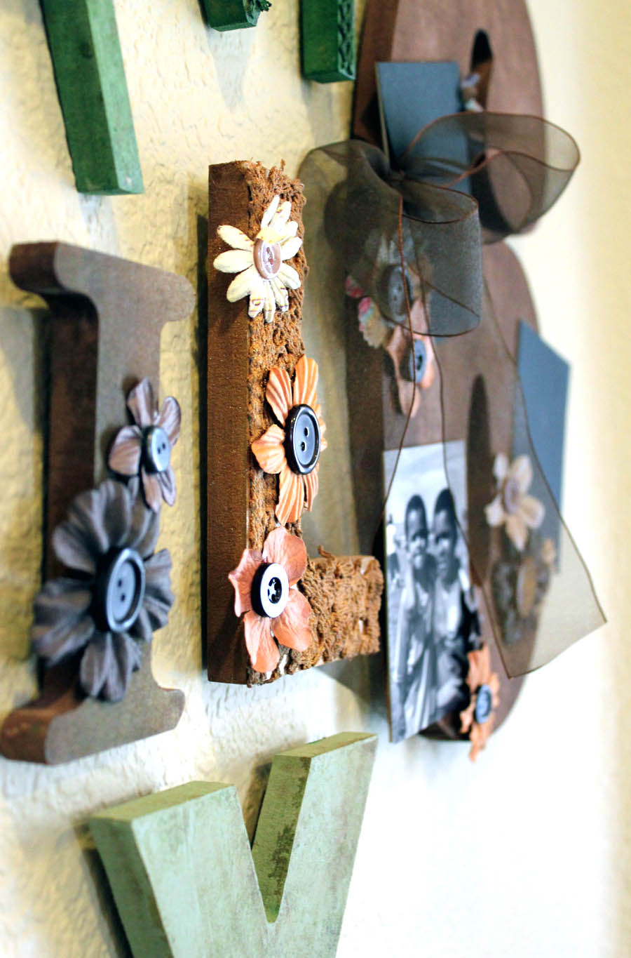 After the letters were dry, I added Prima flowers, and some buttons I bought in Los Angeles in the Garment District. A couple pieces of 3×4 chipboard on the number “6” create frames for photos of my sister's family.