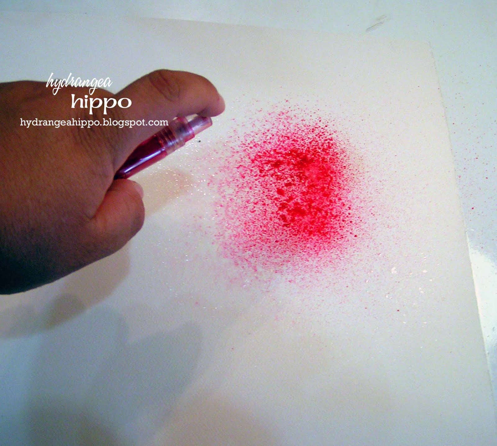 Now spray a little of the Smooch Spritz. You'll want to spray 1-3 pumps of Spritz. Tilt the page so the Smooch and water run down the page–these drips are very spray painty!