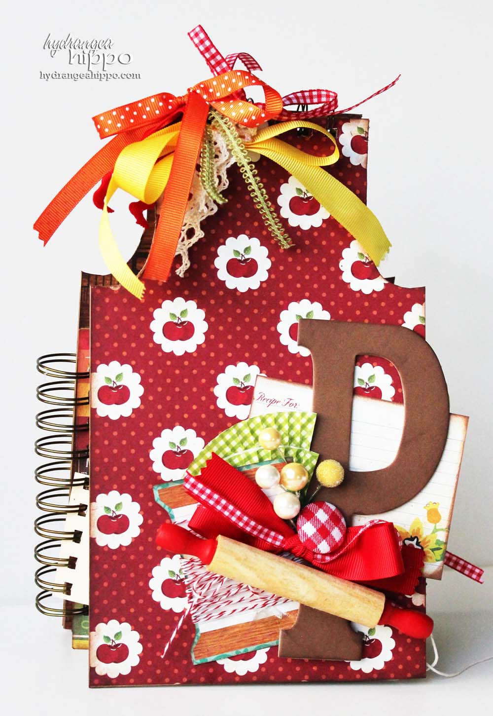I created this sweet little mini album for recipes or just for family memories. I started creating apron-shaped mini albums about 3 years ago when I was inspired by a book my friend Elena created for her book club. I've created all kinds of variations ever since, my favorite being this version where we use the Bind It All to make it sturdy and create an easel from the front cover of the book.