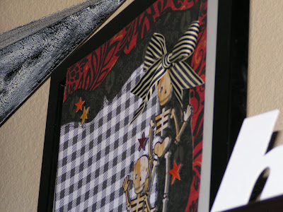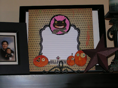 Here are the layouts — I put them up on a bookcase to be Halloween decoration until after Oct31 and then I'll put this year's pics on them. They are too cute to just stick in my stack of stuff!! On this first layout I made a Matthew skeleton and a Katie skeleton–they are pretty cute!!! Katie has the bow of course…