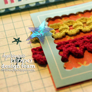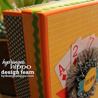 Adding trim on the edge added that little bit of texture and color that pulled the papers together. For my topper, I used a few of the playing cards included in the kit, cut the little “v”s in the orange ribbon and made a super fun rosette out of the grey fringe ribbon, an accordion folded strip of cardstock and one of the cardstock stickers. LOVE IT!
