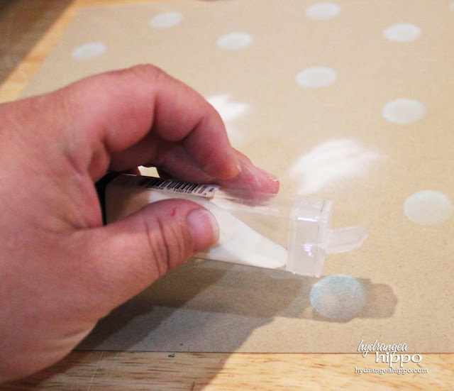 Next sprinkle all the dots with clear embossing powder. This will help to dry the ink as well as give the dots a glossy finish against the matte kraft background.