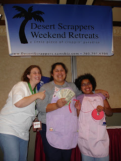 On Friday November 14, 2008 Katie and I went to Desert Scrappers Retreats. For the last year and a half I have taught every Saturday at this retreast but I didn't want to miss the FiskFriendzy on Saturday in Long Beach so I came out to Desert Scrappers on Friday night instead. Katie once again passed out “Fairy Fly-Bys” and stencils for our Innovations Contest. I sold Scrapbook Royalty tote hooks and chatted with ladies about everything Scrapbook Royalty does. I also saw Nan there! LOL She is everywhere… There were 70 croppers in attendance and we raised $261 for Friends of Scott.