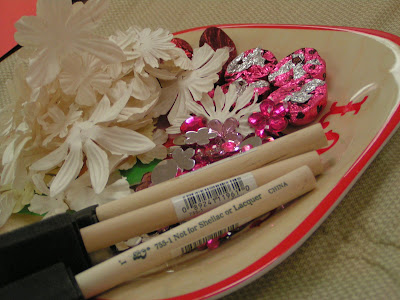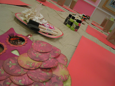 The event benefited Cancer Coping Center and Scrapbook Royalty. We had a great group of ladies come out for the class and several more braved the rain to shop and buy raffle tickets. Gloria, DT Coordinator for Pink, was there to help set up and get everyone checked out. Everyone in the class got a couple of extra chipboard goodies to go along with their books as part of a goodie bag in the class. Here's what the table looked like when we started: