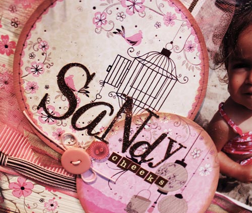 I created this page is about my niece at the beach, playing in the sand. Yes, I actually scrapped! I had a lotof fun creating this whimsical page with the banner and buttons all about princess Kira.