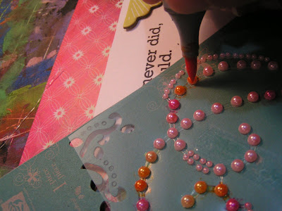 I pulled some Prima Say It In Pearls in pale pink from my stash. Then I chose Copic markers that complimented the colors in my layout. When using colored pearls or rhinestones it is best to choose colors that include the color of the rhinestones (pink in this case) and that are darker than the item already is. These are the Copic colors I chose:
