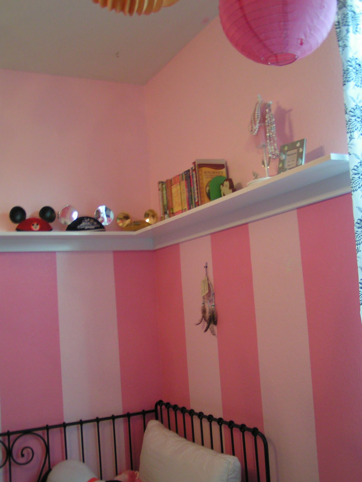 Originally Katie had painted the entire room the darker pink color. It had the effect of Pepto Bismal–with this lighter pink it looks more bubblegum to us now. We left one accent wall the darker pink.