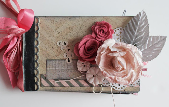On the cover, I sprayed a white paper flower with Smooch Spritz in Cashmere and added it to the cover with a few strips of paper, an adhesive doily diecut, buttons and sticker letters. I spritzed some white floral leaves with Smooch Spritz in Silver Foil and added them under the flower. I also created the 3D roses using wool felt and the Sizzix Flowers, 3D die. I then threaded several ribbons around the spine and tied them in a bow.