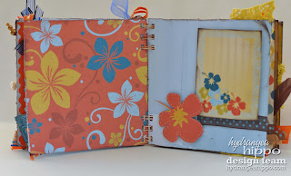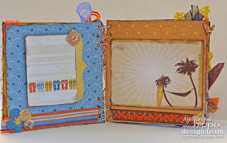 I used some of the other beads and buttons; along with lots of fussy cutting, pop dots, and glossy accents to create a fun layout of my husband learning to surf. In order to add additional photos I attached a little mini album I made using my Zutter Bind-it-All and some 1/4 inch antique brass o-Wires. I dyed the canvas closure with a bit of Spritz from Clearsnap to give it a bit more color.