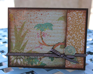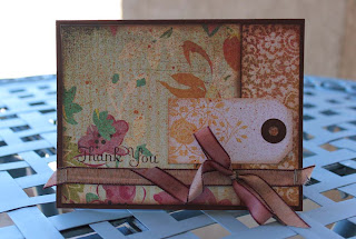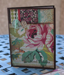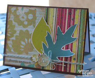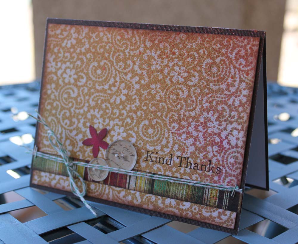 Recently I was able to just sit down at my scrap table and crank out some cards that I needed to send. Just 3 sheets of Basic Grey paper, 2 Epiphany Crafts Shape Studios to make my own buttons and embellies from scrap paper, a bit of twine, some Smooch Spritz in Gingersnap, and a pile of odds and ends (that I was too lazy to put away) contributed to this series of thank you cards in about an hour: