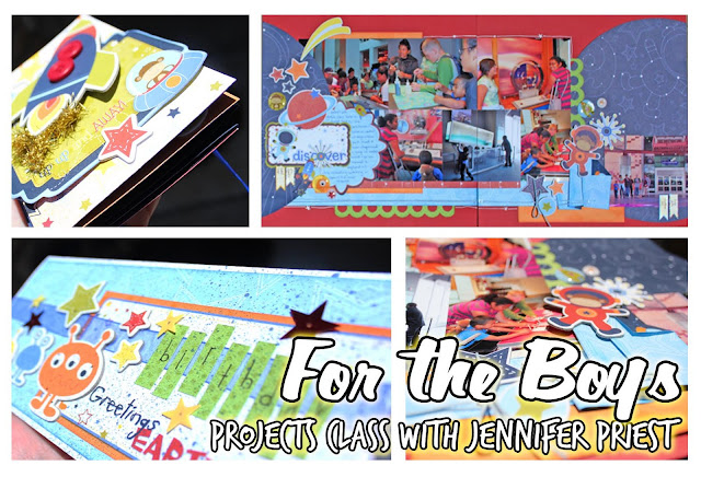 We'll create everything boy in this fun class that's all about your little man. You'll make a layout, a card, and a Mini Book in this class all about boys. Perfect for birthday, amusement parks, or anything “boy” or space related.