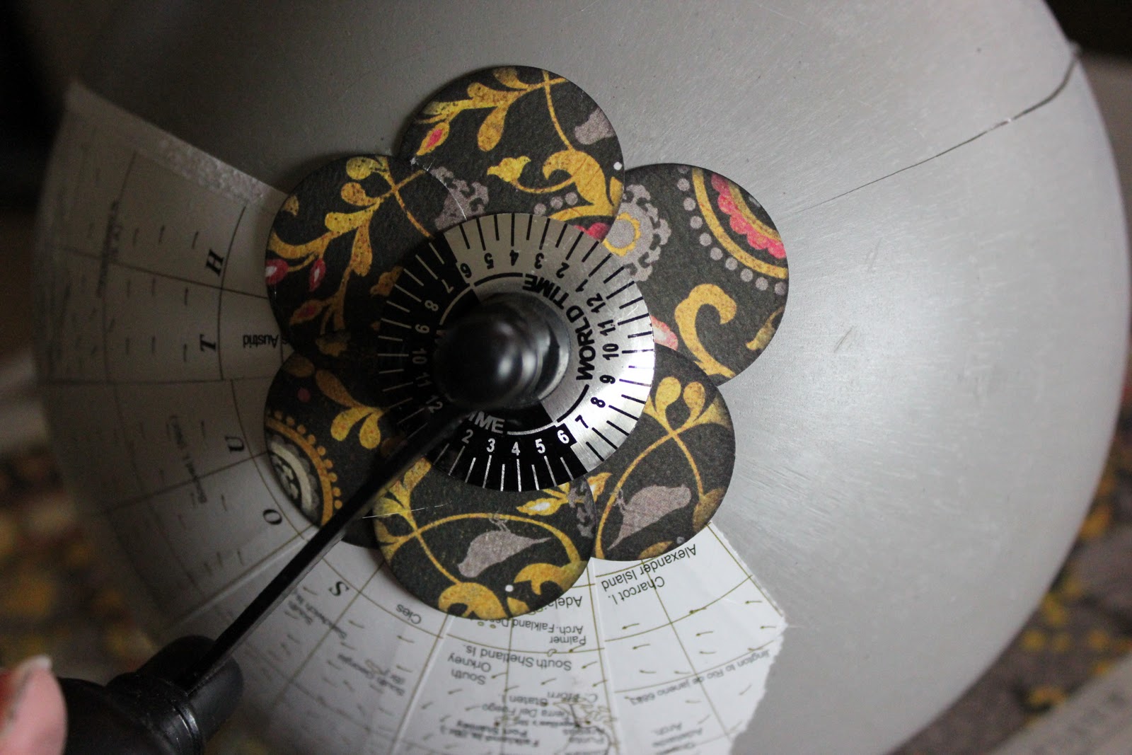 This week I am sharing a globe I have started working on- it's not finished but I just had to share! I got it for $6 at Target because it was damaged – what a deal! I used Authentique Paper punched in circles and started covering the globe from the bottom up. I did this while I was catching up on my Project Runway shows one afternoon.