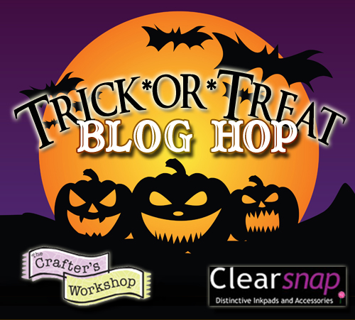 Crafter's Workshop and Clearsnap have teamed up for the next three days to create hauntingly inspiring projects for this Halloween season. It's all tricks, treats, and techniques so join us on a fright night jaunt to remember, hopping from blog to blog. Leave your “Trick-or-treat” comment on each blog in the hop in hopes of winning candy, blog candy that is! For every 50 comments posted on the Clearsnap blog we're giving away a set of inks and accessories to spook up any crafter's projects!!! We'll choose the winners from the blog comments posted on all the blogs in the Hop. The prize includes Smooch Spritz in Frosted Grape, Green Olive, and Carrot Cake, ColorBox Pigment InkPad in Spooktacular, Glitter in Grape Fizz, Design Adhesives in “Trick or Treat” and “Eeeeks!?”, plus our new Design Foils in Lime Burst. That's alot of spook to go around!