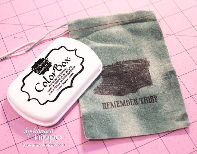 I used Smooch Spritz to color the bag a pretty teal color. Then I used the Stephanie Barnard ColorBox Premium Dye Inkpad in Licorice to stamp a typewriter and sentiment using October Afternoon Stamps. I used a heat gun to heat set the ink and make it permanent. The cotton bags take the ink readily and are so fun for holding tickets, stones, shells, or other tokens from a memorable trip.