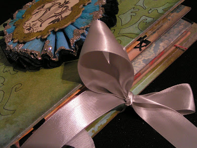 On this book I used Patina and Jazz Blue glimmer mist and 3 different screens. Then I cut a damask diecut using the Quickutz Silhouette and added that to the edges of each cover.