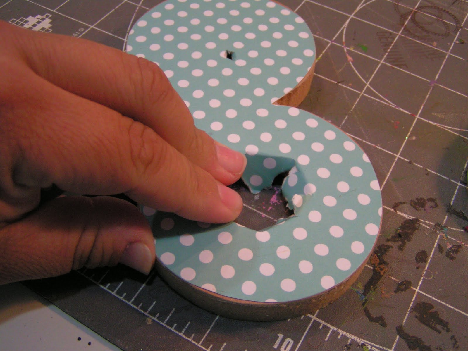 I love that I get to have fun working with Say It With Letters‘ mdf wooden shapes. I can use paper, paint, fabric—whatever I want with them! I have been asked about how I cover and decorate the wood shapes I work with each month so I decided to post a little tutorial on how to best cover a wooden shape with paper. I used the Crafty Scissors shape this time, with lots of curves and some holes so that I can show you how to work with wood shapes with those features.