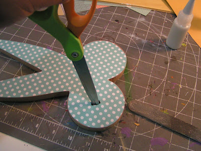 3. Apply the cut out paper to the wood shape. It is okay if it does not meet up to some of the edges perfectly — we'll fix that with paint. You can use a brayer to flatten the paper out, especially if you're using thinner patterned paper.